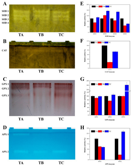 Native-PAGE (polyacrylamide gel electrophoresis) analysis of antioxidant isozymes expressions (A–D) and relative activities (E–H) in leaves of A. triphylla (Thunb.) A.DC. seedlings grown under different temperature regimes (TA, 20/20 °C (day/night); TB, 25/15 °C; and TC, 20/15 °C) after six weeks of cultivation. SOD, superoxide dismutase; CAT, catalase; GPX, glutathione reductase; and APX, ascorbate peroxidase.