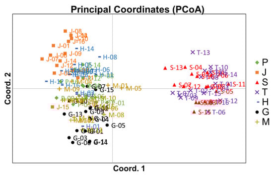Principal coordinate analysis (PCoA) reveals associations between onion cultivars according to evolutionary relationships. P, J, S etc. are the cultivars name as defined in Table 1.