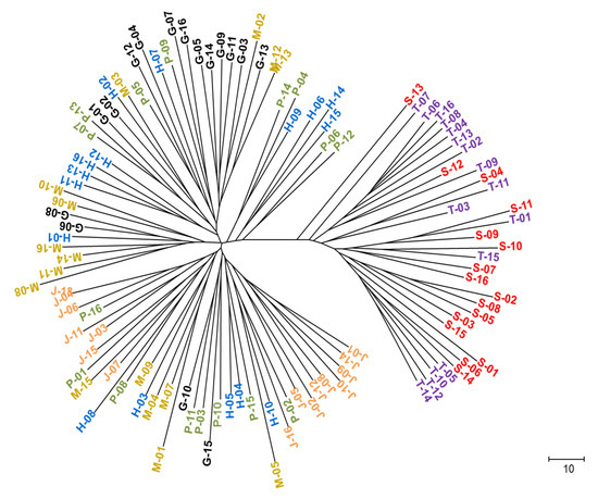 - Saitou, N.; Nei, M. The neighbor-joining method: A new method for reconstructing phylogenetic trees. Mol. Biol. Evol. 1987, 4, 406–425. [Google Scholar] [PubMed]