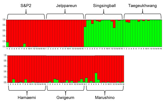 Stratification clustering of the seven onion cultivars, computed by the program STRUCTURE, revealed that the two cultivars Singsingball (S) and Taegeukhwang (T) had similar multiloci when compared to the other five cultivars (Figure 3). This inferred clustering was compatible with clusters obtained from PCoA and the neighbor-joining tree. The cultivar Jelppareun had the most dissimilar genetic identity compared to Singsingball (S) and Taegeukhwang (T).