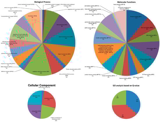 Gene ontology functional classification for G. barbadense with differential expression of 155 genes. GO analysis of 155 protein sequences illustrated for their association with biological processes (BP), molecular functions (MF), and cellular components (CC) along with the Q-value. Results are indicated in pie charts and presented in detail in Table S2.