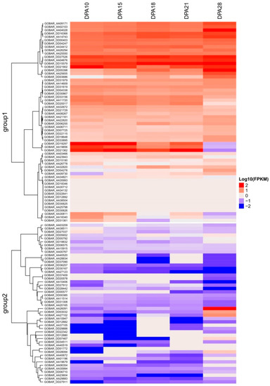 Gene ontology (GO) annotations of G. raimindii- and G. barbadense-based mined genes were carried out by using the cotton functional genomics database (http://cottonfgd/analyze/) to describe their biological process (BP), molecular functions (MF), and cellular components (CC) [28]. In five cellular components, functions related to ribosomes, intracellular, integral components of the membrane, the membrane, and the vesicle coat were identified. Similarly, 21 molecular functions and 19 biological processes were observed, while a maximum of 155 genes was involved in regulating the biological processes (Figure 1). Ultimately, we implemented RNA sequence expression data analysis to verify the genetic annotation functions through gene ontology. RNA sequences were downloaded from the cotton functional genome database (https://cottonfgd.org/). The genes revealed differential expression: 49 genes were found to be upregulated for fiber developmental stages at 10, 15, 18, 21, and 28 days post-anthesis (DPA) (Table S3). Thus, 108 genes out of 155 were involved in the upregulation of various tissues; a heatmap was constructed that only addresses fiber developmental stages on the basis of their respective expression levels (log10) (Figure 2; Table S4). The heatmap constructed for 108 genes identified on the basis of G. barbadense genome sequence and four genes, GOBAR_DD21902, GOBAR_DD15579, GOBAR_DD27526, and GOBAR_AA04676, showed highly significant expression 10, 15, 18, 21, and 28 days post-anthesis (DPA), while GOBAR_DD21362, GOBAR_DD19297, and GOBAR_AA19856 showed highly significant expression at all points except 28 DPA. There were also certain genes not directly related to fiber development and presented in Table S1 that were found to be significantly involved in biotic and abiotic stress responses under stress conditions, like NAC family, COL3, COL4, UBX2, CRKs, MED33A, MED33B, L1YMB, and ABC transporter family.