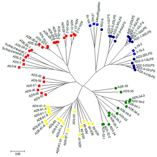 To test the potential use of EST-gSSRs for assessing the genetic diversity among novel germplasm of G. barbadense and G. darwinii collected from the Galapagos Islands, the allelic data from 111 EST-gSSRs were used to construct a dendrogram (Figure 3 and Figure S1). Genetic distance, based on Nie’s method [34], was calculated by using power marker version 3.25 software (Bioinformatics Research Center, North Carolina State University, Raleigh, NC, USA). The wild accessions of Gossypium were grouped into five distinct clusters using the neighbor-joining (NJ) clustering pattern. The improved varieties of G. barbadense, i.e., 3-79-2 and 3-79-3, were found to lie between the AD2-1-1, AD2-1-2, AD2-1-3, AD2-1-4, AD2-1-5 and AD2-2, AD2-3-1, AD2-3-2, AD2-4-1, AD2-4-2 accessions of G. barbadense. Similarly, the three other improved cultivars, XH-18, XH-21, and Sibruk Egyptian, plus wild type AD2-6, make up Cluster I. AD2-6 was found to be closer to XH-18, XH-21, and Sibruk Egyptian. A total of 17 accessions of G. barbadense (two improved and 15 wild types) collected from Santa Cruz Island constitute Cluster II. Thirteen accessions of G. darwinii collected from Santa Cruz Island exist in Cluster III close to G. barbadense accessions of the same origin, indicating the significant natural introgression of alleles/genes among the two species of Gossypium [36]. Cluster IV was comprised of 17 G. darwinii accessions collected from San Cristobal Island. A total of 25 (five improved and 20 wild types) accessions of G. darwinii were grouped into Cluster V. AD5-26-1 and AD5-26-2 are closely related to improved cultivars AD5-3, AD5-7, Subsp. darwiniiII-1, and Subsp. darwiniiII-1, indicating the fixed alleles found among wild-type accessions of G. darwinii. The PIC value ranged from 0.037 to 0.825 (average: 0.489) for G. darwinii, which was higher than that of G. barbadense (0.091–0.774, average: 0.459).