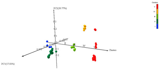 Two-dimensional principal coordinate analysis (PCoA) of 79 accessions of G. barbadense and G. darwinii collected from the Galapagos Islands. Blue (Cluster I), Green (Cluster II), Light green (Cluster III), Orange (Cluster IV), Red (Cluster V).