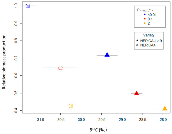 Relative biomass production (under water stress relative to field capacity) plotted against carbon isotope discrimination (δ13C) in two rice varieties (NERICA-L-19 and NERICA4) grown in lowland soil. P was applied to achieve P concentrations in soil solution of <0.01 mg L−1, 0.1 mg L−1, and 2 mg L−1. Error bars represent the standard error on the δ13C.