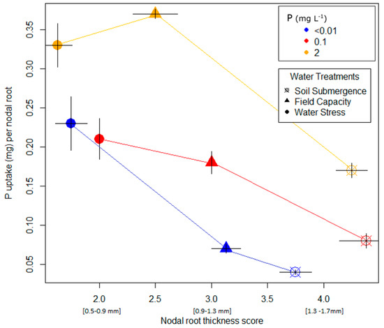 P uptake (mg) per nodal root versus the nodal root thickness scores from NERICA-L-19 grown in lowland soil (pots) under combinations of P rates (<0.01, 0.1, and 2 mg P L−1) and water levels (water stress, field capacity, and soil submergence). Standard errors of the means are presented by the error bars. With decreased water availability root thickness decreases and P acquisition efficiency (Pupnodal) increases. Reduced soil P availability decreases P uptake per nodal root.