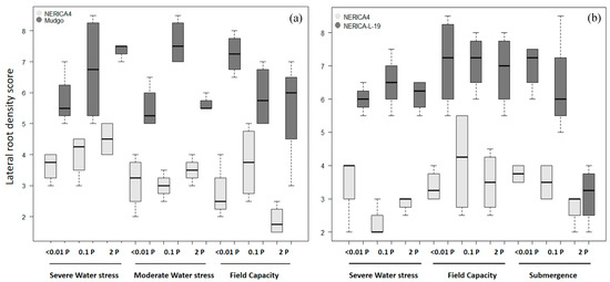 Side-by-side boxplots of basal lateral root density scores from the roots of NERICA4 (light) and NERICA-L-19 (dark) in the lowland pot trial (right panel, b) and NERICA 4 (light) and Mudgo (dark) in the upland pot trial (left panel, a). Each soil was subjected to three P-rates (<0.01, 0.1, and 2 mg P L−1) and three different water levels. The density scores are based on the Maize ‘shovelomics board’ [43] and were determined after root harvest at 46 DAS. For each trial, NERICA4 has the smallest basal lateral root density for all treatment combinations.