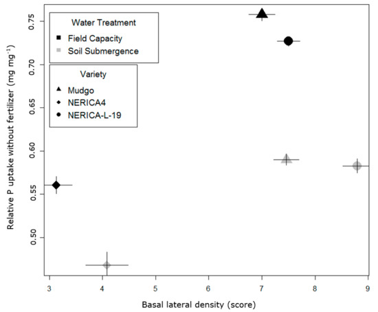 Relative P uptake of different rice varieties (i.e., the P uptake without P fertilization relative to the P uptake when P is sufficiently available) in relation to the observed basal lateral density (analyzed at 51 DAS). Three varieties (NERICA4, Mudgo, and NERICA-L-19) were grown on a lowland rice field with (30 kg P ha−1) and without (0 kg P ha−1) P fertilization and they were subjected to two water treatments (soil submergence versus field capacity). The higher basal lateral branching density relates with the low P tolerance of contrasting varieties and reduced water availability additionally enhances this relative P uptake.