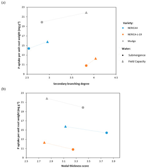 The P uptake (mg) per unit root mass (g) versus the secondary branching degree (a), and nodal thickness (b) in response to reduced water availability (Soil Submergence versus Field Capacity). Data are presented for three varieties grown on a lowland field without P application.