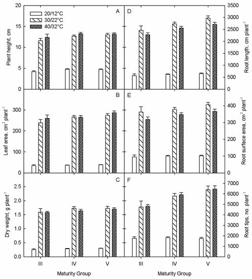 Temperature and maturity group interaction for (A) plant height, (B) leaf area, (C) dry weight, (D) root length, (E) root surface area, and (F) root tips for soybean 64 cultivars harvested 20 days after sowing. Data shows mean + SE.
