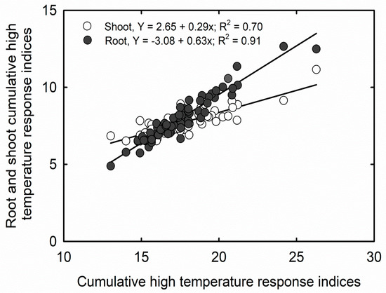 Correlation between cumulative high-temperature response indices and cumulative high-temperature response indices calculated for root and shoot parameters separately among 64 soybean cultivars, measured at 20 days after sowing.
