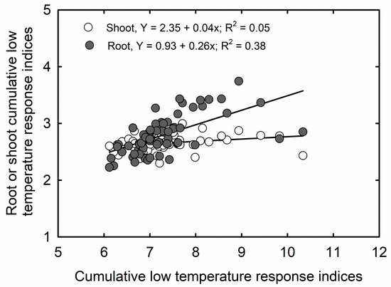 Correlation between cumulative low-temperature response indices and cumulative low-temperature response indices calculated for root and shoot parameters separately among 64 soybean cultivars, measured at 20 days after sowing.