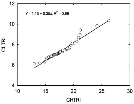 Cumulative stress response indices for low temperatures classified 2l cultivars as cold sensitive, 32 cultivars as moderately cold sensitive, six cultivars as moderately cold tolerant, and five cultivars as cold tolerant, based on the means and SD. Cultivars CZ 5225 LL and GS47R216 were identified as most sensitive and tolerant to LT, respectively (Table 4). Unlike CHTRI, CLTRI has had a poor correlation to CLTRI calculated for the shoot (r2 = 0.05) and root parameters (r2 = 0.38) separately (Figure 3). However, CLTRI had a significant and positive correlation with CHTRI (p < 0.001; r2 = 0.96) (Figure 4).