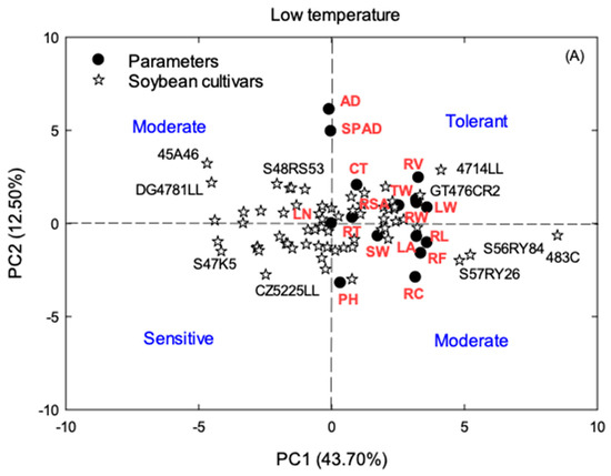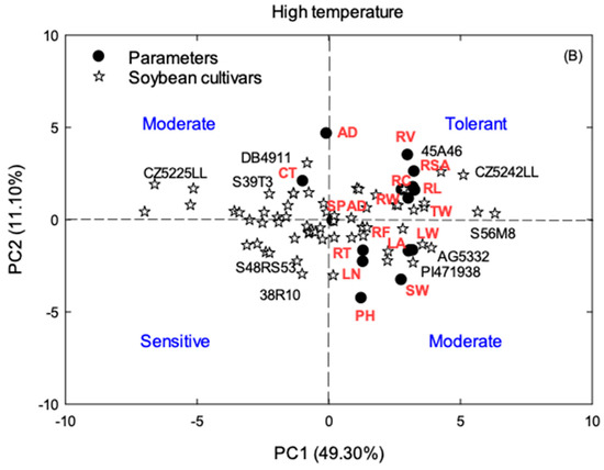 Principal component analysis (PCA) biplot for the first two principal component (PC) scores, PC1, and PC2, related to the classification of 64 soybean cultivars (open stars) for low (A) and high-temperature (B) tolerance. The eigenvectors for the crop traits (solid circles) are superimposed with the PC biplot scores at the similar scale that reflect the contribution of each parameter in the determination of tolerance or the susceptibility towards heat or cold. The eigenvector values were multiplied by ten to obtain a clear and superimposed figure.