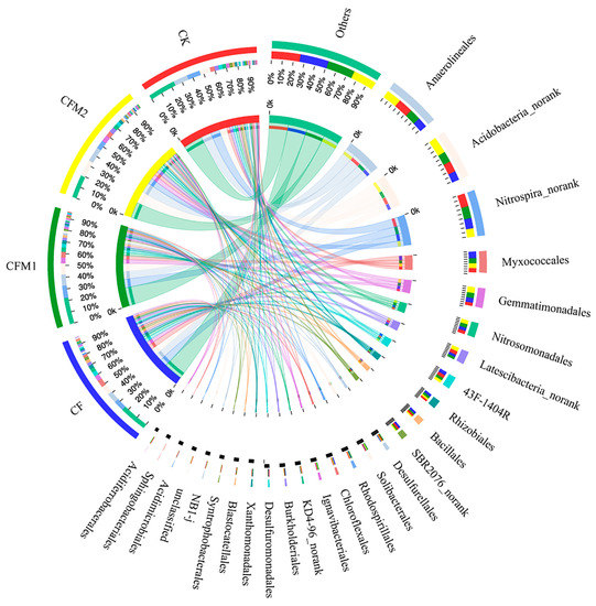 At the order level, the relative abundance of the dominant groups were indicated in Figure 2. All the treatments were dominated by the order Anaerolineales, which accounted for 9.1–13.2% of the total reads, followed by bacterial taxa belonging to Acidobacteria (8.0–14.5%), bacterial taxa belonging to Nitrospira (7.4–11.2%), Myxococcales (4.0–6.4%), and Gemmatimonadales (3.1–5.7%). Treatment CFM2 resulted in the highest abundance of Anaerolineales, bacterial taxa belonging to Acidobacteria, and Gemmatimonadales, while treatments CF and CK possessed the highest abundance of Myxococcales and bacterial taxa belonging to Nitrospira, respectively. A high rate of organic fertilizer amendment greatly decreased the relative abundance of bacterial taxa belonging to Nitrospira, candidate bacterium SBR2076, unclassified bacteria, and Syntrophobacterales, by 34.6%, 43.6%, 44.0%, and 45.3%, compared to CK. The proportions of Solibacterales in treatments CFM1 and CFM2 were 1.55 and 1.77 times as much as that in CK, respectively. However, few difference was detected in order distribution among different fertilization treatments, approximately 90% of the total order groups were shared by all the treatments as shown in the Venn diagram (Figure S2). Furthermore, significant correlations were observed between most soil properties and the relative abundance of some dominant order groups, especially those with noteworthy differences in relative abundance among different fertilization treatments (Table S3).