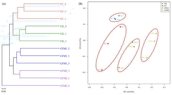 Hierarchical cluster (a) and principal coordinate analysis (PCoA) (b) of the bacterial community structures. CK, without fertilizer; CF, fertilizers NPK; CFM1, fertilizers NPK plus 30% organic manure; and CFM2, fertilizers NPK plus 60% organic manure.