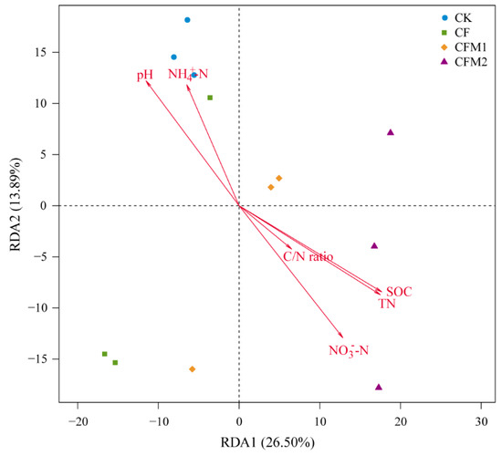 Redundancy analysis (RDA) of bacterial community structures and soil properties. CK, without fertilizer; CF, fertilizers NPK; CFM1, fertilizers NPK plus 30% organic manure; and CFM2, fertilizers NPK plus 60% organic manure.