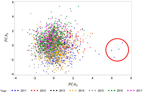 Collectively, these observations suggest that these two PCAs can be used as indices to distinguish apparent improved chemical composition quality as a result of reduced yield and lower starch deposition (unfavorable) from actual improved chemical composition in conjunction with higher yields (favorable). Arithmetic means of the PCAs showed that positive mean values for PCA1 occurred in 2012, 2016, and 2017, whereas positive mean values for PCA2 occurred in 2011–2013 (Table 4; Figure 1). Four outliers from 2011 with extreme PCA2 values were discovered in the scatterplot and were removed prior to stepwise regression analyses (Figure 1).