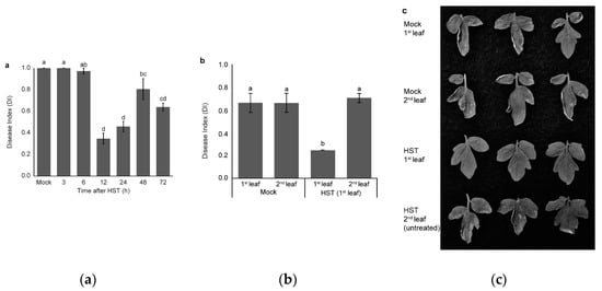 There was no significant difference in disease severity between mock (DI 1.00) and plants inoculated at 3 h (DI 1.00) and 6 h (DI 0.97) after HST. Disease severity significantly reduced in plants inoculated at 12 and 24 h after HST to DI 0.35 and 0.46, respectively, relative to mock plants. Thereafter, disease severity increased to DI 0.81 at 48 h and decreased again to DI 0.64 at 72 h after HST (Figure 1a). Significant reduction in disease severity was observed in the first leaves, but not in the second leaves when only the first leaves were treated with HS (Figure 1b,c).
