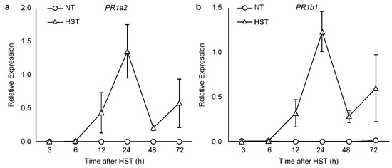 Figure 2. Changes in (a) PR1a2, and (b) PR1b1 expression levels in the tomato cultivar Natsunokoma. Gene expression levels in the first leaf at 3, 6, 12, 24, 48, or 72 h after HST (45 °C, 2 min) were quantified by qPCR and normalized to GAPDH expression. Vertical bars indicate the standard error of the mean (n = 4).