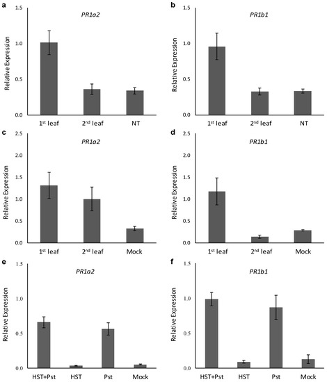 Figure 3. Relative expression levels of PR1a2 and PR1b1 in the leaves of the tomato cultivar Natsunokoma after partial treatment by HS, Pst inoculation or combined HS + Pst inoculation. Only the first leaf was subjected to HST at 45 °C for 2 min (a,b) or dipped into Pst solution (c,d). Thereafter, total RNA from the first and second leaf was extracted at 24 h after HST or Pst inoculation. In combined treatment (e,f), Pst was inoculated at 24 h after HST. Total RNA from the first leaf was extracted at 48 h after Pst inoculation, which was 72 h after HST. Gene-expression levels were quantified by qPCR and normalized to GAPDH expression. Vertical bars indicate the standard error of the mean (n = 6).