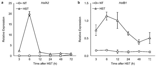 Figure 4. Changes in the relative expression level of (a) HsfA2 and (b) HsfB1. Gene expression levels in the first leaf at 3, 6, 12, 24, 48, or 72 h after HST (45 °C, 2 min) were quantified by qPCR and normalized to GAPDH expression. Vertical bars indicate the standard error of the mean (n = 4).