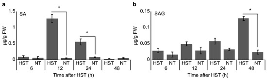 Figure 5. Accumulation of (a) salicylic acid (SA) and (b) salicylic acid b-d-glucoside (SAG) at 6, 12, 24 and 48 h after HST. Vertical bars indicate the standard error of the mean (n = 3). Significant differences between groups (indicated by asterisks) were obtained from performing two-tailed t-tests, p < 0.05. FW, fresh weight.
