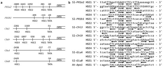 Figure 6. (a) The location of possible heat shock elements (HSEs) in tomato PR genes. The numbers indicate the distance (in bp) from the proximal transcription start site (ATG). TATA represents the TATA box consensus sequence. (b) Comparison of the HSE from tomato PR genes (Sl-) and Arabidopsis apx1 (At-). Sequences matching the nGAAn, the basic 5 bp HSE motif are indicated in uppercase letters. Orientation of the nGAAn-like motifs are indicated by arrows.
