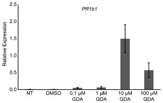 Figure 7. The relative expression level of PR1b1 in the leaves of the tomato cultivar Natsunokoma at 24 h after geldanamycin (GDA) treatment. Different GDA concentrations (0.1, 1, 10, and 100 µM) and 0.1% (v/v) dimethyl sulfoxide (DMSO) were applied by foliar spray. Gene expression levels were quantified by qPCR and normalized to GAPDH expression. Vertical bars indicate the standard error of the mean (n = 4).