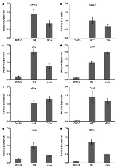 Figure 8. Relative expression level of PR (af) and Hsfs (g,h) genes in the leaves of the tomato cultivar Natsunokoma at 24 h after treatment with DMSO, HST, and GDA. 0.1% (v/v) DMSO and 10 µM GDA were manually applied by foliar spray. Gene expression levels were quantified by qPCR and normalized to GAPDH expression. Vertical bars indicate the standard error of the mean (n = 4).