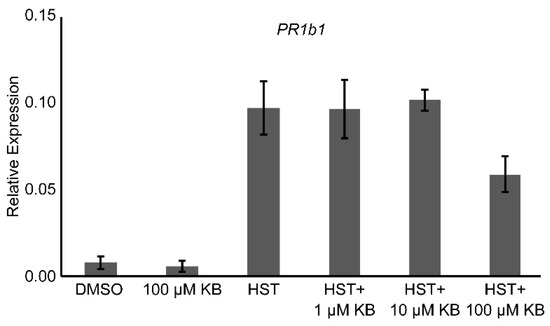 Figure 9. The relative expression level of PR1b1 in the leaves of the tomato cultivar Natsunokoma at 24 h after HST combined with KB. Different KB concentrations (1, 10, and 100 µM) were manually applied by foliar spray at 6 h after HST. Gene expression levels were quantified by qPCR and normalized to GAPDH expression. Vertical bars indicate the standard error of the mean (n = 4).