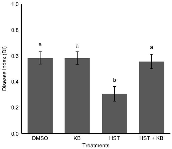 Figure 11. Disease severity upon inoculation of Pst. 1% DMSO, 100 µM KB, HST, and HST combined with 100 µM KB manually applied by foliar spray at 6, 12, and 18 h after HST. Vertical bars indicate the standard error of the mean (n = 3). Different letters indicate significant differences among treatments based on Tukey’s test, p < 0.05.