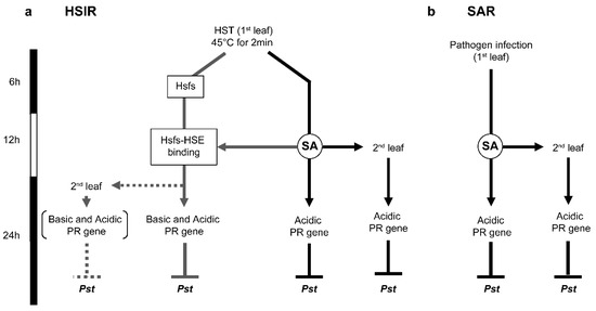 Figure 12. Comparison between HSIR (a) and systemic acquired resistance (SAR) (b). Black lines indicate proved pathways and gray lines indicate proposed pathways as elucidated by the work reported herein. During HSIR, Heat shock induced Hsfs gene expression, followed by SA accumulation, which in turn enhanced Hsfs binding to HSE, thereby activating non-systemic stimulation of basic and acidic PR gene expression. Disease severity in the first leaf was significantly reduced concomitantly with upregulation of PR gene expression when Pst was inoculated.