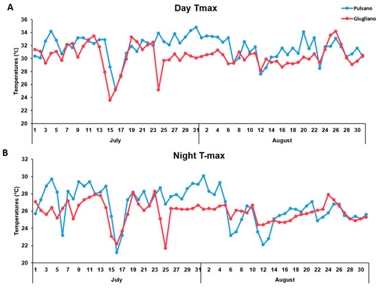 Maximum temperatures recorded in the experimental fields located in Giugliano and Pulsano during the day (A) and the night (B) from June to August 2016.