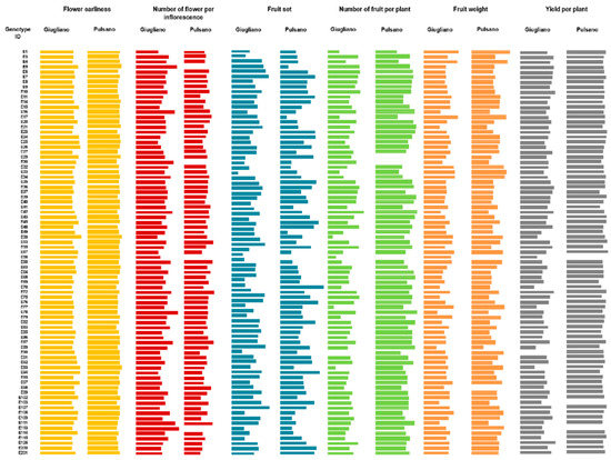 The tomato landraces grown under high temperature conditions were phenotyped for six traits related to flower and fruit set, and for productivity. Mean data related to all the traits measured on plants grown in the two experimental fields are reported in the Supplementary Table S1, and summarized in Table 1 and Figure 3. ANOVA revealed that there were significant differences (p < 0.05) among tomato genotypes, growing locations, and their interaction, thus highlighting that the environment deeply influenced all the traits under study. As a whole, flower earliness in the experimental field located in Giugliano was anticipated compared to the experimental field located in Pulsano, with the number of days from sowing ranging from 56 to 72 in the former and from 63 to 75 in the latter (Table S1). This was probably due to the different soil composition, which may have consequently influenced the complete root development time.