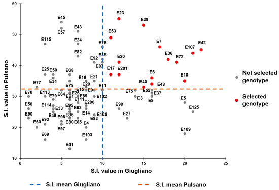 Finally, in order to select the best performing genotypes under high temperatures, a Selection Index (SI) was calculated for each genotype and for each experimental field considering the three traits FS, TNF and YP. This index varied from 1 (genotype E70) to 22 (E42) for genotypes grown at Giugliano, and from 13 (E41) to 55 (E23) for those grown in Pulsano. This analysis allowed us to select 15 best performing genotypes that fell in the upper right quadrant of the scatter plot shown in Figure 4, since they combined higher SI scores in both experimental fields. These genotypes will be further evaluated in more experimental trials carried out under high temperatures, in order to confirm their higher performances in facing heat stress.