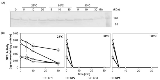 Approximately 0.1 mL of the soluble protein, with a concentration of 8.5 μg/μL, was exposed to various temperature treatments of 28 °C, 60 °C, and 90 °C for intervals of 0, 5, 10, and 30 min incubations. At the time interval, 30 µL of the soluble proteins were taken and the heating treatments were stopped by immersion of the sample tube in ice. The treated sample was further analyzed for SPS enzymatic activity using spectrophotometer and expressed as µg sucrose/minute/µg protein. The proteins profile was monitored by immunoblotting using the specific polyclonal antibody against SPS [24].