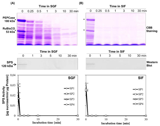 Western blot analysis showed that the SPS protein was completely digested in 1 min by SGF and SIF assessments (Figure 2A,B, middle). The result of the activity assay was also in good agreement with the protein profiles from Western blot analysis. The loss of enzymatic activity was shown after 1 min incubation of the digestive enzymes, that indicated the SPS activity is rapidly inactivated (Figure 2A,B, lower). Collectively, the results showed that SPS and other proteins in transgenic sugarcane can be degraded by the enzymatic digestion system.