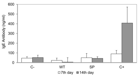 The specific-IgE levels in sera between the non-transgenic and transgenic sugarcane groups were compared to interpret the potential allergenicity of the transgenic crops. The antibody titers at day 7 and day 14 were observed to evaluate the accumulation of IgE in sera. The production of antibodies at day 7 was lower in titer and appeared similar among samples from the C−, WT, SP, and C+ groups (Figure 3). Statistical analysis showed that there is no significant difference (p > 0.05) between the C−, WT, SP, and C+ samples at day 7. Synthesis of allergen-specific IgE generally occurred at approximately 7 days, and the peak of the IgE titer was produced during days 10 to 14; thus, a booster injection was required to stimulate increased levels of IgE [45,46]. Continuous ingestion of OVA showed a significant increase in the IgE level at day 14, which was higher by almost four-fold than IgE production at day 7 (Figure 3). Statistical analysis showed a significant difference (p < 0.05) between rats fed OVA and those fed transgenic sugarcane juice. However, the IgE titers of C− and SP samples at day 14 were shown to be comparable with the IgE titers at day 7. Moreover, the declined antibody titers of the WT group samples at day 14 suggested the degradation of antigens. Based on the animal model experiments, the results of the specific-IgE assessment indicated that transgenic sugarcane juice has no potential to be allergenic.
