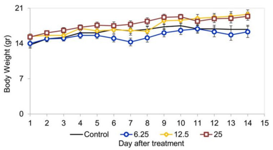 The body weight of mice was measured daily for 14 days, and the recorded data was plotted on a graph (Figure 4). The result showed that there were slight gains in body weight at the doses of 6.25, 12.5, and 25 gr/kg body weight. The body weight gain was a reflection of the normal pattern of body weight growth, since a similar growth pattern was observed in the mice treated with the control CMC-Na solution. Statistical analysis showed that there was no significant difference (p > 0.05) in regard to the gain in body weight between sugarcane juice treatments and the control. Thus, all treated mice had similar body weight in both groups during 14 days of observation.
