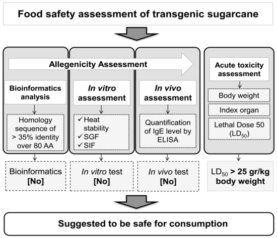 The allergenicity evaluation consists of three steps: Bioinformatics analysis, in vitro thermal testing and digestive stability assessments, and in vivo IgE analysis in rats. These assessments were conducted according to the guidelines of the Codex Alimentarius Commission. Furthermore, toxicity testing was conducted by acute oral toxicity assays in mice with a procedure adopted from the OECD. Moreover, it has been documented that sugarcane has not been associated with an allergenic response, as there have been no reports regarding food-related allergic reactions to sugarcane [47]. Thus, we propose a model for the risk assessment framework in transgenic sugarcane as shown in Figure 5.