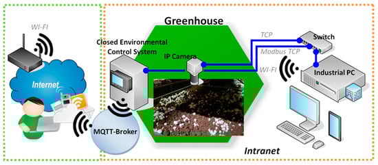 We built a small mushroom greenhouse for experimentation and system verification. The built greenhouse is shown in Figure 2. The greenhouse was built and modified by a general closed refrigerator. Many kinds of sensors were installed in the greenhouse to measure the temperature, humidity, and carbon dioxide level. The temperature and humidity of the soil were also measured in the greenhouse. The designed watering module was used to automatically maintain the moisture in the soil. We also designed a microclimate regulator to control the temperature, humidity, and carbon dioxide level. We designed our own fuzzy controller to control the microclimate by closed loop equipment. The communication structure of our system is shown in Figure 3. The TCP/IP protocol was used for communication and the IP network camera was used for capturing the mushroom images. The software, YOLOv3 algorithm, and image processing algorithm were developed using C++ language. An industrial computer was used for calculations. We used CPU to execute the YOLOv3 algorithm. The MQTT Broker was used for message broadcasting [25]. The system employed included the Publisher, which broadcast the message to the Subscriber (mobile device) according to the image analysis results.