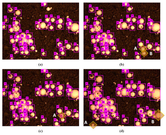 Uneven illumination and shadowing have a serious impact on image measurement in practical applications. It is also easy to make image recognition errors. This study addresses the above problems. For example, a result of the mushroom localization and recognition is shown in Figure 5 with different capturing times. The first result is shown in Figure 5a, where the time is denoted as . After a specific interval, the time is denoted as ( is set as one hour), at which point we captured another image and the recognition result is shown in Figure 5b. We can see that mushrooms A and B can be detected in Figure 5a but are missed in Figure 5b. The recognition results with images captured at times and are shown in Figure 5c,d, respectively. We can see that a few mushrooms cannot be located using the first identification process, but they are detected in the other process. In order to solve this problem, a positioning correction algorithm was designed in this paper. The algorithm flowchart is shown in Figure 6.