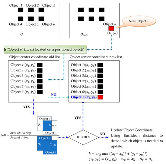 The positioning correction algorithm is based on the first results of the mushroom localization. Taking Figure 6 as an example, the time of the first positioning is , and six objects are recognized (Object 1, Object 2, …, Object 6). The coordinates (xi, yi), width (), and height () of each object are recorded. The next time of positioning is , and the results are based on the previous positioning results. If the center coordinates of a recognized object (Object u) is not located on a positioned object, the recognized object is new one. When the coordinates of “Object u” are located on a positioned object, the Intersection over Union (IoU) is executed to calculate the proportion of overlapping area. In order to reduce unnecessary calculations, we find “Object k”, which is closest to “Object u” to perform IoU. “Object u” is set to be a new object if IoU is less than 0.8; otherwise it is set to “Object k”. The minimum distance object estimation formula is as follows: