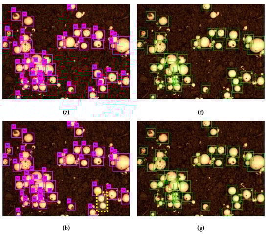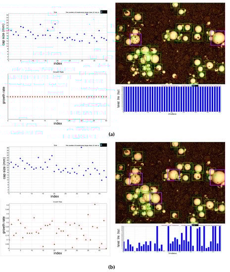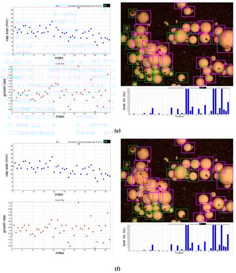 In the experiment depicted in Figure 9, the measurement is automatically executed every hour. Figure 9a is the start of the measurement and the growth rate was 0 for each mushroom at that time. Forty-one mushrooms were detected in the first positioning. The detected mushrooms were denoted as No. 0–No. 40. Two mushrooms were detected as larger than the expect harvested size (we marked them with purple squares). They were No. 19 (27.2 mm) and No. 32 (34.6 mm). The initial harvest time was 96 h. Figure 9b shows the measurement results after 7 h. There were 44 mushrooms detected. Four mushrooms were newly detected, where No. 43 was the newest detected mushroom at the 7th hour. Its growth rate was 0 and its harvest time was estimated as 23 h. The results after 14 h are shown in Figure 9c. The number of detected mushrooms was 47. There were three new detected mushrooms at this time and five mushrooms had reached the designated harvest size. The estimated harvest time for the top 50% mushrooms was 9.5 h. After 21 h, the result is shown in Figure 9d. The number of detected mushrooms was 47. There was no new detected mushroom but 12 mushrooms reached the harvest size. The estimated harvest time was 4.6 h. Figure 9e shows the results at 28 h. There were 21 mushrooms that satisfied the harvest size out of 48 detected mushrooms, and the estimated harvest time was 1.6 h. At 29 h, the results are shown in Figure 9f. There were 24 mushrooms bigger than the designated harvest size out of 48 detected mushrooms. At this time, the goal of 50% of the mushrooms being ready for harvesting was achieved and the estimated harvest time was 0 h. Please denote that there was one mushroom with a growth rate of 0.