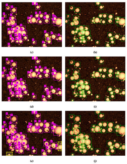 The period of the positioning correction is one harvest cycle. A single planting procedure (fermentation, spawn running, soil covering, and mushrooming) includes three harvest cycles. When the mushroom grows to the target size and the number of mushrooms reaches a set value, the mushroom measurement system is stopped. Or, when the system reaches a set time, the measurement system is also stopped. A message is sent when the system is stopped and the system then waits for the next harvest cycle. The first captured mushroom image is set to be the initial position for each positioning correction. The experiment results are shown in Figure 8, where Figure 8a–e are the original positioning images and Figure 8f–h are the the positioning correction results. The difference in image positioning of each mushroom is framed by a yellow dotted line. We can see that the positioning correction is effective to make up the missing area.
