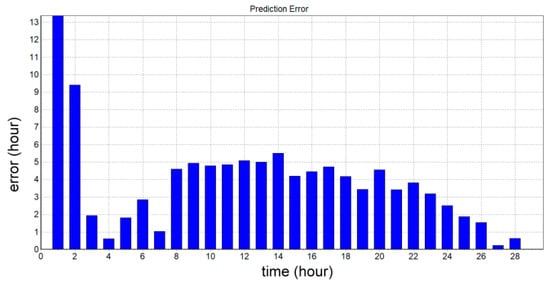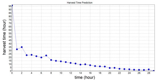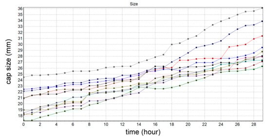 We collect all estimated harvest times in the 29 h and show the results in Figure 11. We also used the known harvest time to compute the estimated error. The errors of each time are shown in Figure 12 and the average error was 3.7 h. The numbers of detected mushrooms at each measurement time are shown in Figure 13. We can see that the bigger mushrooms were easier to identify by the YOLOv3 algorithm. This does not affect the performance of the system because the small mushrooms are not considered harvesting objects. We also randomly selected 10 mushrooms to record the growth size and the results of these are shown in Figure 14. The experiment data can be a reference for the conditions related to plant mushrooms.
