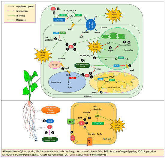 Si supplementation of plants alleviates D stress. Several mechanisms including the activation of photosynthetic enzymes [11], the activation of enzymatic antioxidant defense systems, increased water use efficiency [12,13], nutrient uptake [14], root growth and hydraulic conductance [15], and the accumulation of organic osmolytes [16] are involved in Si-mediated growth improvement under D [11,17].