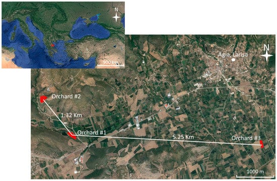 The experimental farms were located in Agia, Larisa (Thessaly, central Greece), an agricultural area producing mostly pome fruits (apples, pears), stone fruits (peaches, apricots, cherries) and olives. Three commercial cherry orchards located in different sites (approximately 2.5 ha each) were selected for the experiments (Figure 1). Each orchard included several cherry cultivars (Table 1). This common practice allows growers to expand the fruit collection period and therefore to achieve better prices on the market. On the other hand, the temporal divergence of cherry ripening among the different cultivars makes the implementation of control strategies against R. cerasi rather challenging. The orchards’ pruning system involved a linear palmetta formation, i.e., flat supported canopy development. The tree density in all orchards was 1660 trees/ha with a spacing of 4 m between rows and 1.5 m between trees. The age of the trees was 4.5 years, the average height of the canopy was 3.25 m (minimum 2 m and maximum 4.5 m depending on the cultivar) and the height of the trunk varied from 0.5 to 0.6 m. A drip irrigation system was used, and no intercropping method was applied in the respective orchards. The average yield was 10 T/ha (minimum 8 and maximum 12 T/ha).
