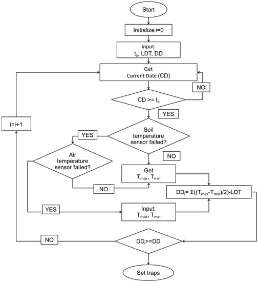 Both parts of the DSS algorithm performed well in field conditions leading to sound decisions. By adopting a simple degree day model, we managed to bring installation of the trapping network quite close to the beginning of adult R. cerasi flight in the wild, reducing the cost of population monitoring (e.g., labour for additional inspections, more traps used because of debris accumulations, etc.).
